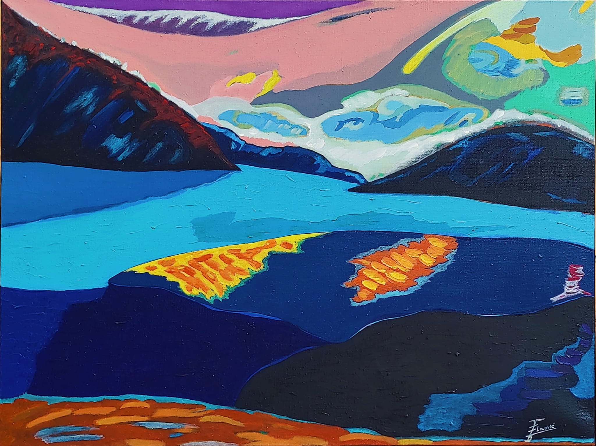 Zamiast dosłownych widoków artystka proponuje sugestywne wizje: gwałtowne pociągnięcia pędzla, kontrastowe barwy, organiczne tekstury, które oddają nie tyle wygląd, co esencję krajobrazu. Jej prace są pełne energii i witalności — jakby sama natura przemawiała przez farbę. Widać w nich fascynację żywiołami: wodą, wiatrem, kamieniem i światłem. To nieprzypadkowe — dla Editi Vlaović-Dominik krajobraz to przestrzeń duchowa, a nie geograficzna.