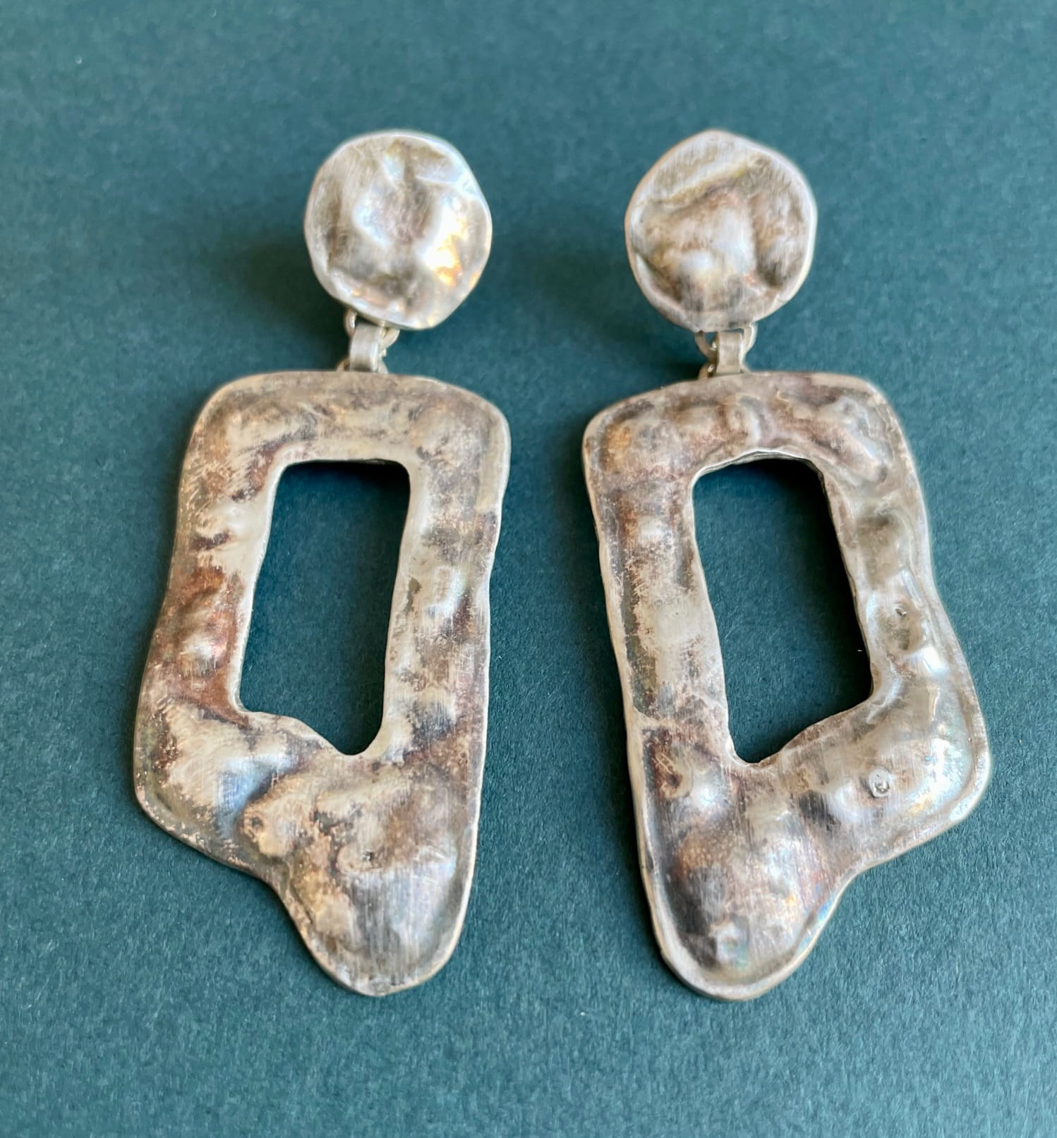 Kolczyki srebrne (próba 925, ok. 9 g )wiszące (ok. 6,5 cm długości), na sztyft. Nieregularne, duże formy, wykonane z ręcznie wykuwanego srebra. Duże kolczyki są bardzo efektownym akcentem stylizacji a jednocześnie poprzez precyzje wykonania są lekkie i wygodne do noszenia.
