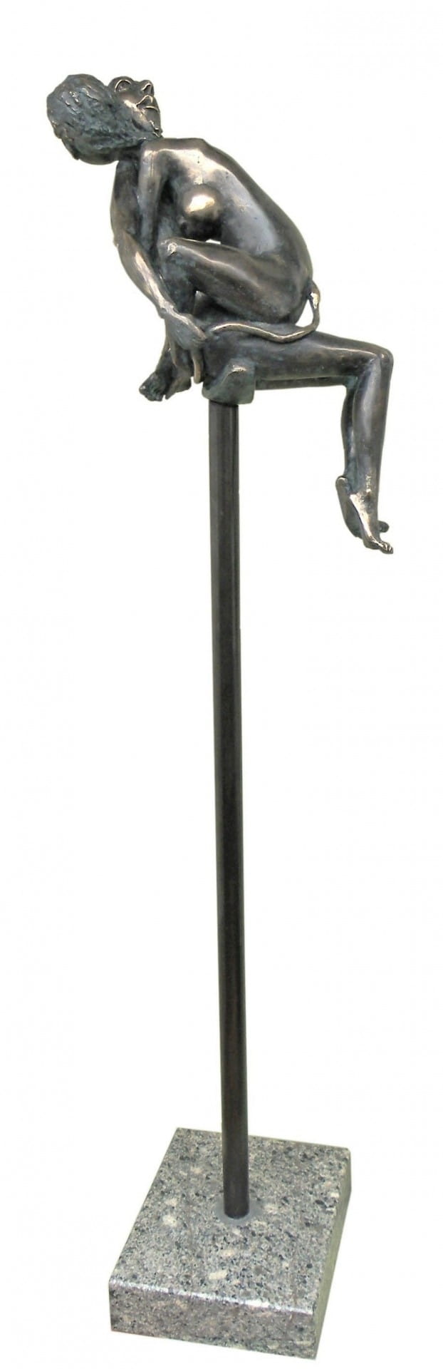Rzeźba z brązu zawieszona w powietrzu na kamiennym postumencie.